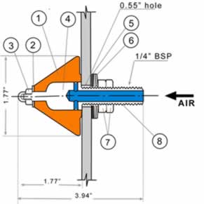 How it works Compressed air is introduced by the Airbrator into the container in a round pattern generating a thin layer of air between the bin wall and the product. Due to this air cushion, product friction against the wall is drastically reduced thus causing material to fall much easier. The white polymer cone is shaken by the compressed air generating a light vibration helping evacuate the material. When the nozzle is totally immersed in the product and not operating, product weight and the elasticity of the plastic cone keep the device against the wall preventing any product from entering the air line. |